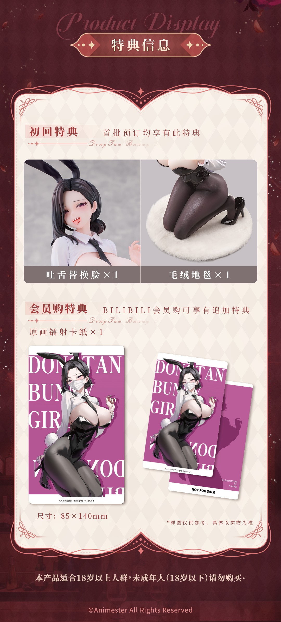 比例:1/6尺寸:約186mm材質:PVC、ABS原畫:K Pring官方定價:238人民幣開售日期:2025年9月12日出貨時間:2026年第1季初回特典:吐舌替換臉、毛絨地毯B站特典:原畫雷射卡紙