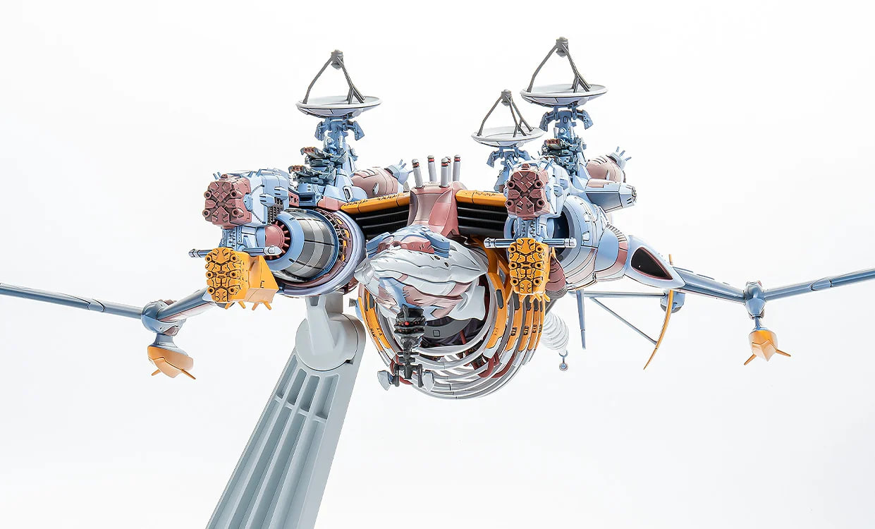 主砲およびアンテナは可動式。肋骨のような白い構造体と複雑な配管、そこに内包される主機の様子もつぶさに観察できます。